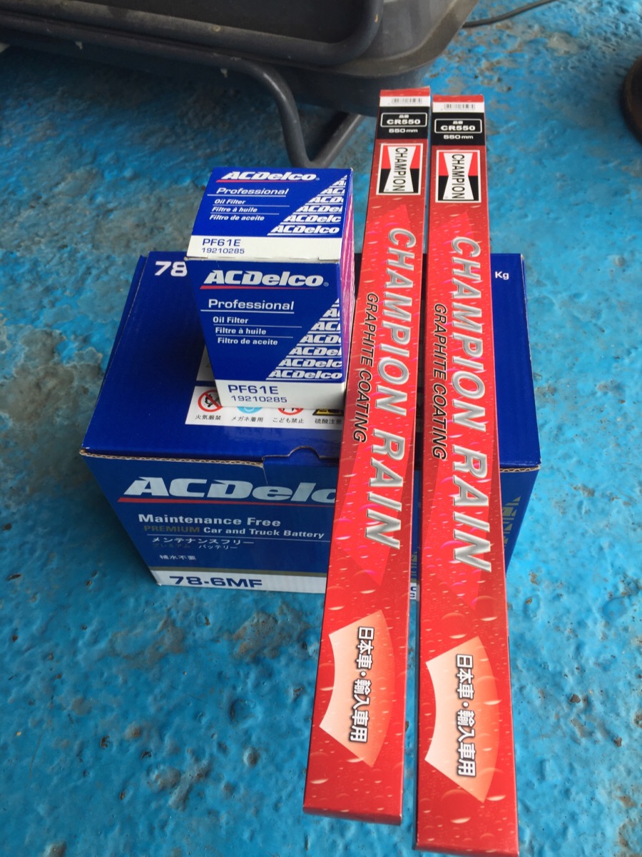 シボレーのお客様は夏前にバッテリーとオイルとワイパー交換で来店です。