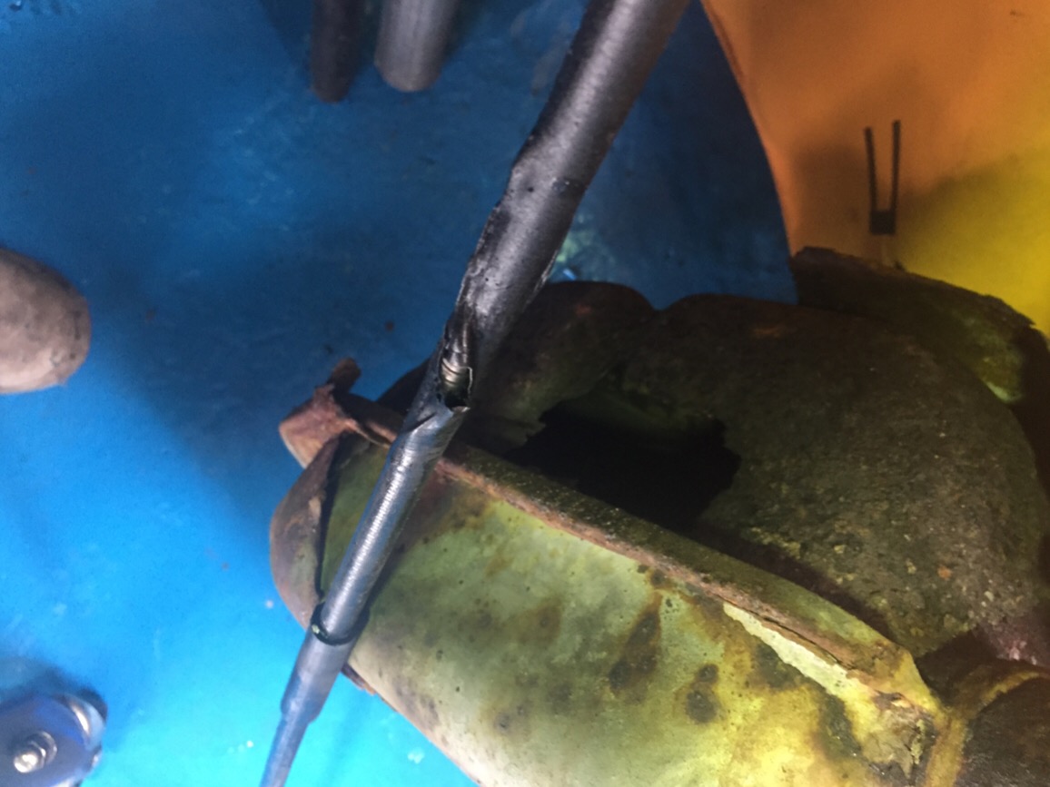 1台目はマフラー排気漏れに伴うサイドブレーキワイヤーの被覆の溶けです。